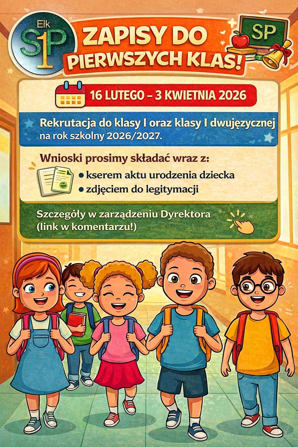 Informujemy, że w dniach 16.02.2026. - 3.04.2026 prowadzona będzie rekrutacja do klas I na rok szkolny 2026/2027.